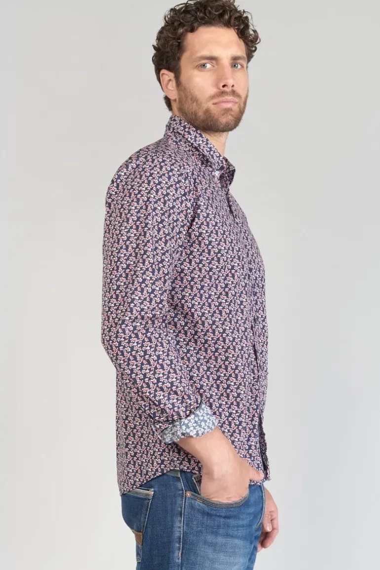 Cette Chemise Floy Bleu Marine Vous Donnera Un Look Raffine Et Elegant Avec Son Motif A Petites Fleurs Rouges, Ses Boutons Nacres Noirs Et Ses Revers Aux Poignets Avec Lisere Personnalise « Le Temps Des Cerises » Et Empiecement Contrastant.Pour Le Detail Final, Un Mini Lisere Drapeau Bleu, Blanc, Rouge Dans Le Dos.