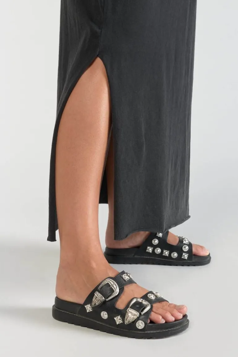 Cette Robe Longue Poppy Noire Est Le Parfait Melange Entre Feminite Avec Sa Coupe Longue Fendue De Chaque Cote Sur Le Bas Et Tendance Avec Son Tissu Noir A L’Effet Delave Avec Un Imprime Ton Sur Ton A Paillettes.