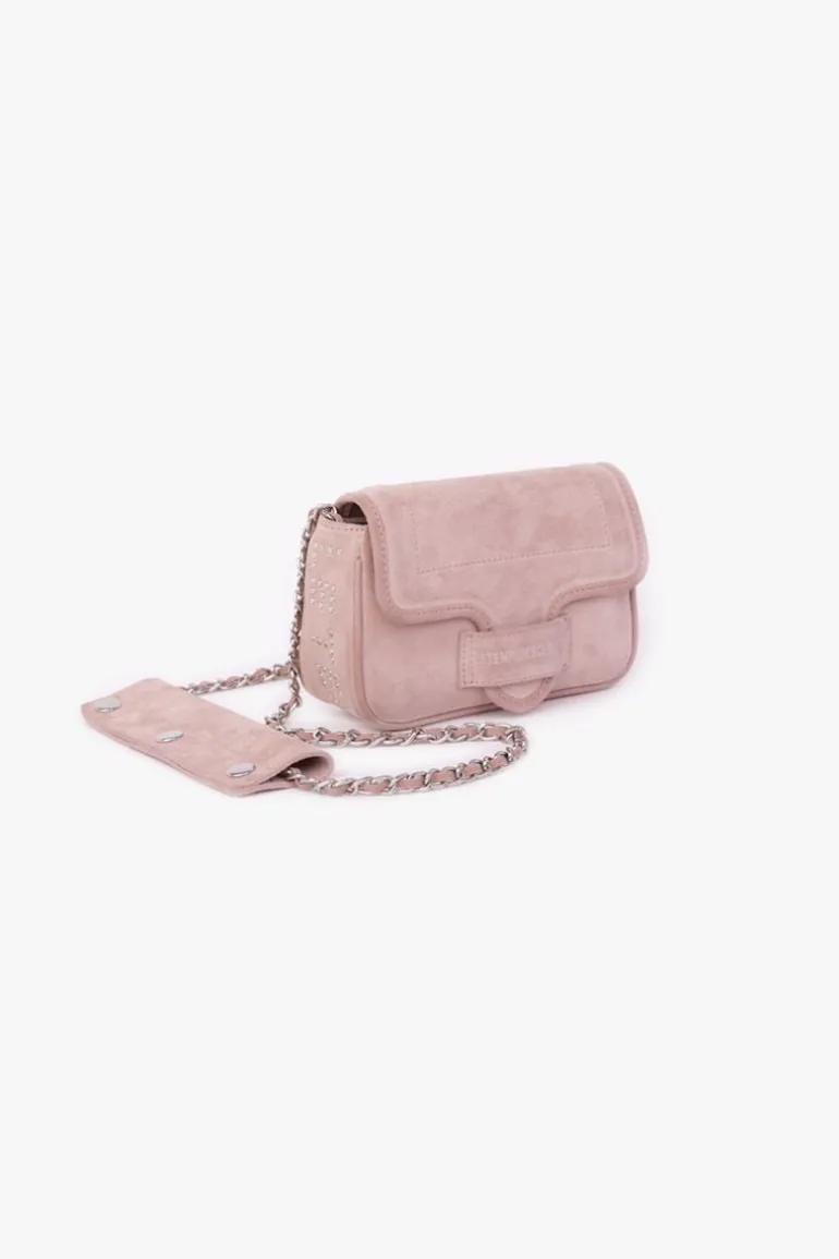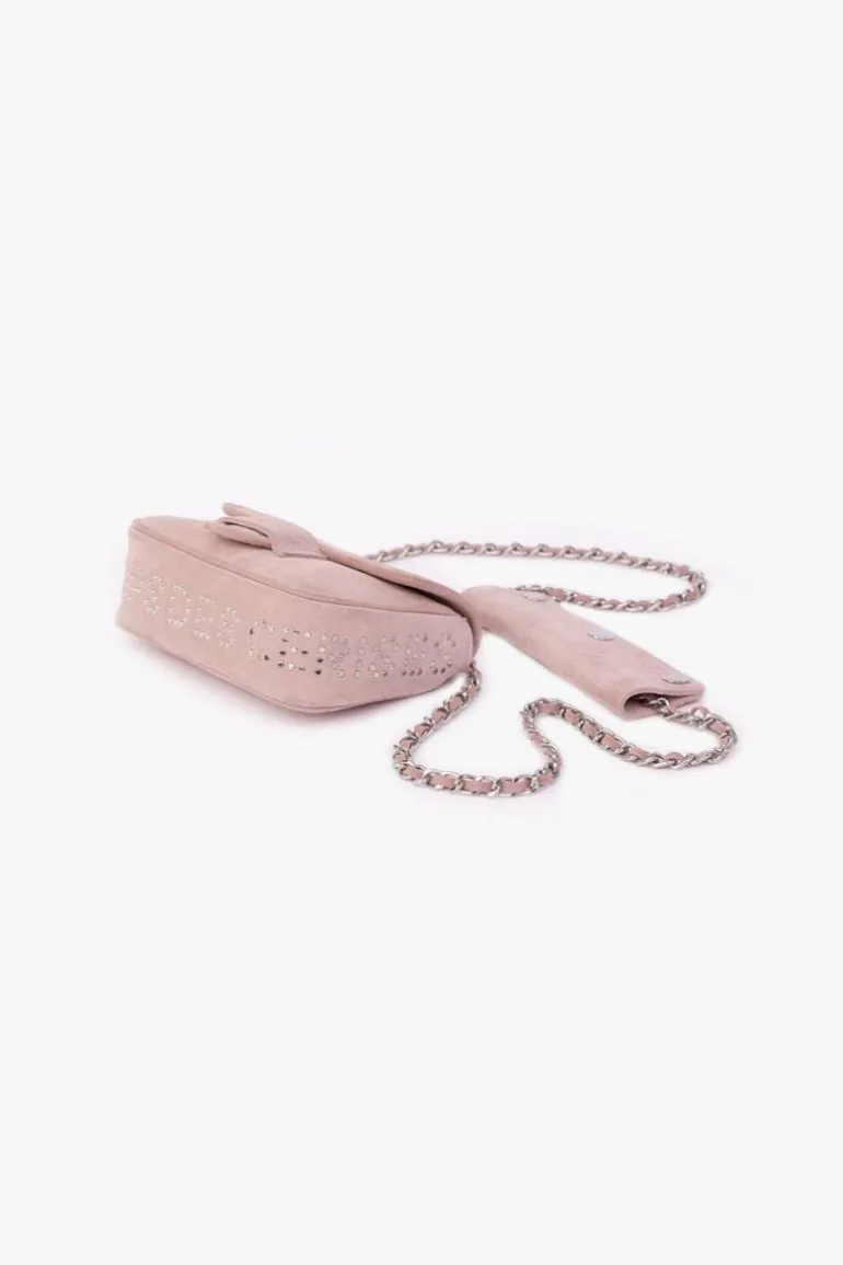 Ce Sac Klelia En Cuir Suede Accompagnera Parfaitement Votre Look, En Journee Ou En Soiree, Il Apportera Le Cote Feminin Tendance A Votre Tenue Grace A Sa Couleur Rose Poudre, Sa Bandouliere En Chaine Argentee, Ainsi Que Ses Clous Et Son Attache-Rabat Personnalises « Le Temps Des Cerises ». Un Renfort D’Epaule Amovible En Cuir Personnalise « Cerises » Et Cloute Vient Decorer La Bandouliere Et Apporte Plus De Confort.