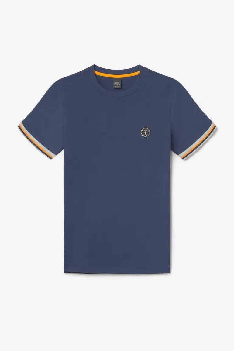 Ce T-Shirt Grale Allie A La Perfection Look Casual Avec Son Jersey Bleu Marine Intemporel Et Look Tendance Avec Son Lisere Gris Et Orange Fluo Au Niveau Des Manches. Pour Le Detail, Un Ecusson Le Temps Des Cerises Sur La Poitrine.
