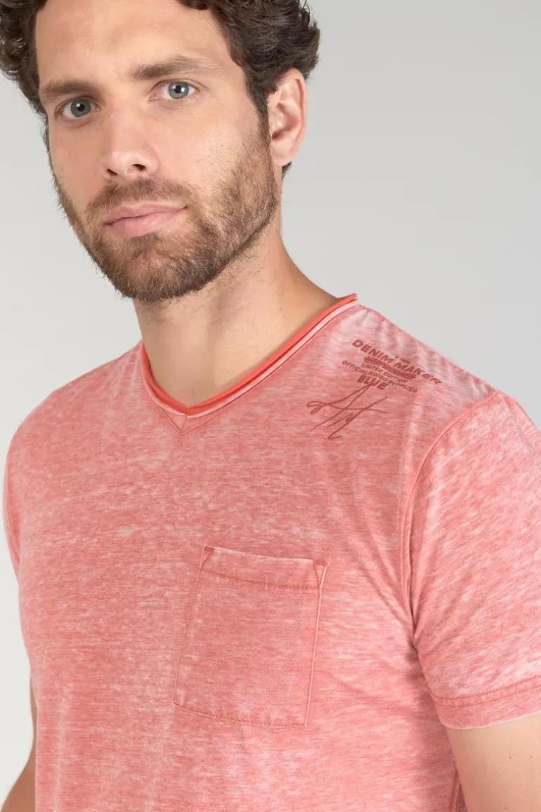 Ce T-Shirt Mavoc A Un Look Casual Avec Son Tissu Leger Rouge Chine A L’Effet Delave, Son Col En V Double Bicolore Avec B…