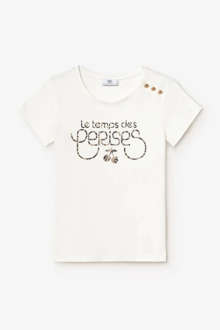 Ce T-Shirt Savana Blanc Vous Donnera Un Look Casual Avec Son Imprime Personnalise « Le Temps Des Cerises » A Motif Noir Brillant Et Taupe Ainsi Que Ses Trois Boutons Decoratifs Dores Au Niveau De L’Epaule Gauche.