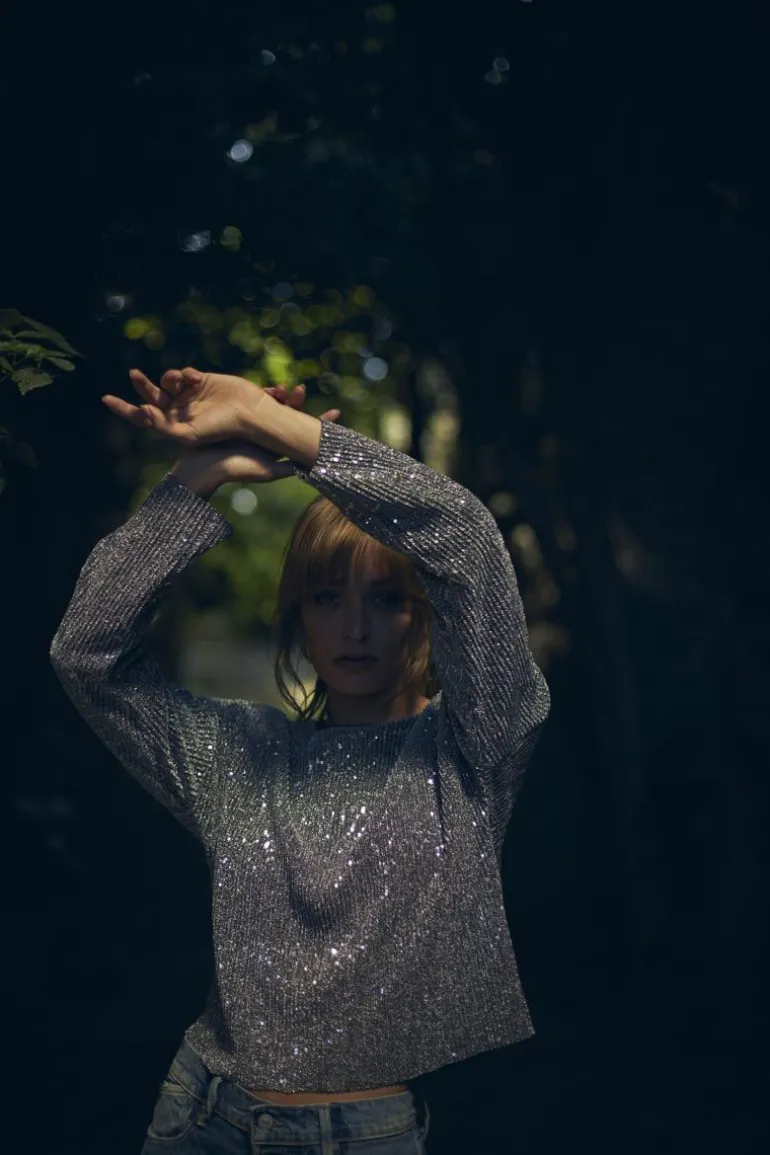 Ce Top Able Est Parfait Pour Vos Soirees Habillees Avec Son Tissu Plisse Argente Parseme De Sequins Argentes Pour Un Cote Rock. Le Top Est Double Pour Plus De Confort.
