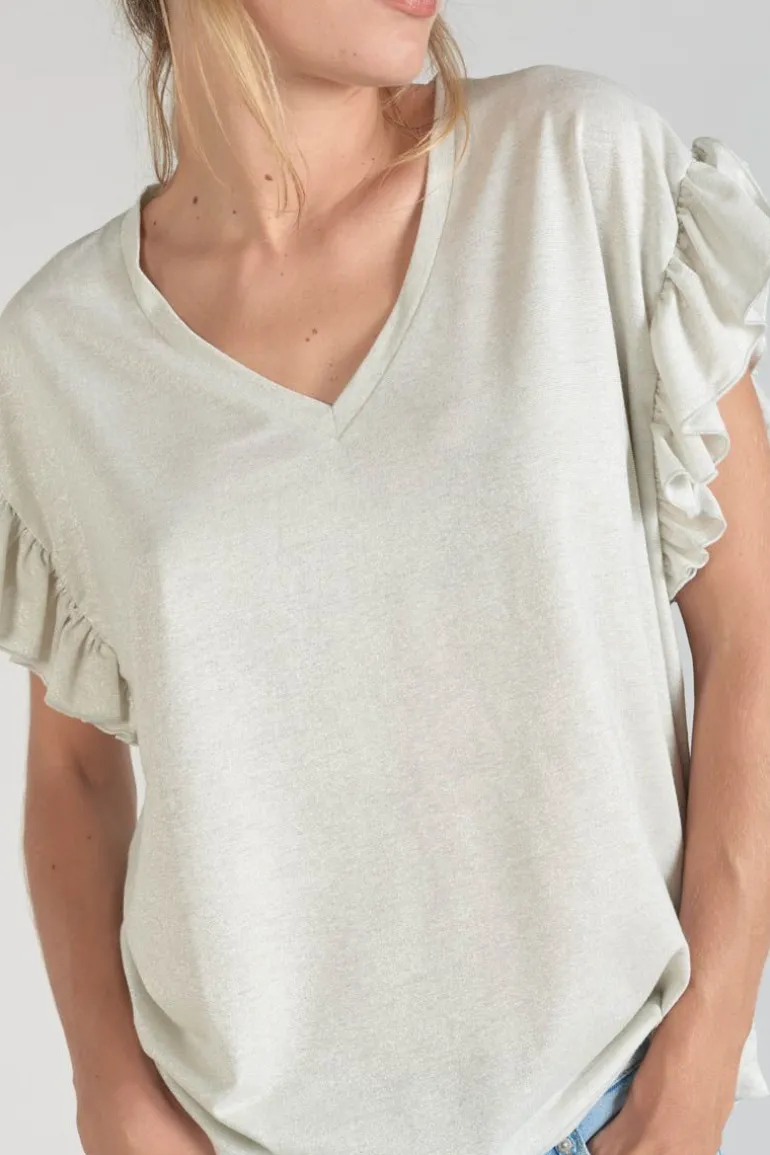 Ce Top Ryls Est Tres Elegant Et Feminin Grace A Son Tissu Blanc Irise Argente, Ses Volants Au Niveau Des Epaules Et Son Col V. Pour Plus De Confort, Son Tissu Doux Est Agreable A Porter.