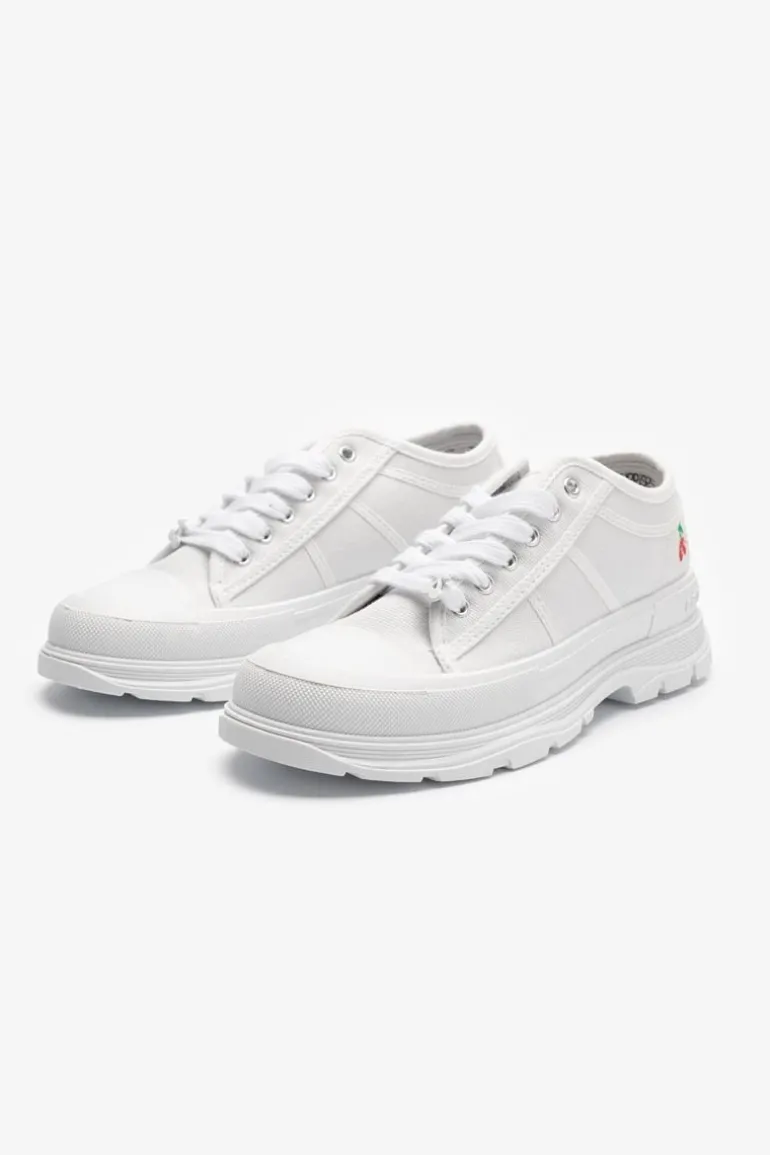 Ces Baskets En Toile Blanches Avec Leur Semelle Epaisse Blanche Sont L’Accessoire Ideal Pour Look Branche. Pour Le Detail, Des Cerises Rouges Sur Le Cote.