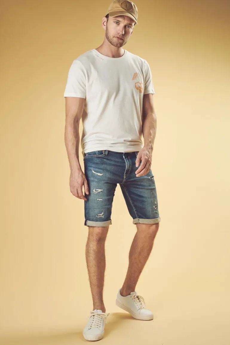 Ce Bermuda A La Toile Tres Stretch Vous Donnera Un Look Tendance Avec Son Delavage Bleu Ainsi Que Ses Abrasions Et Trous Repares.