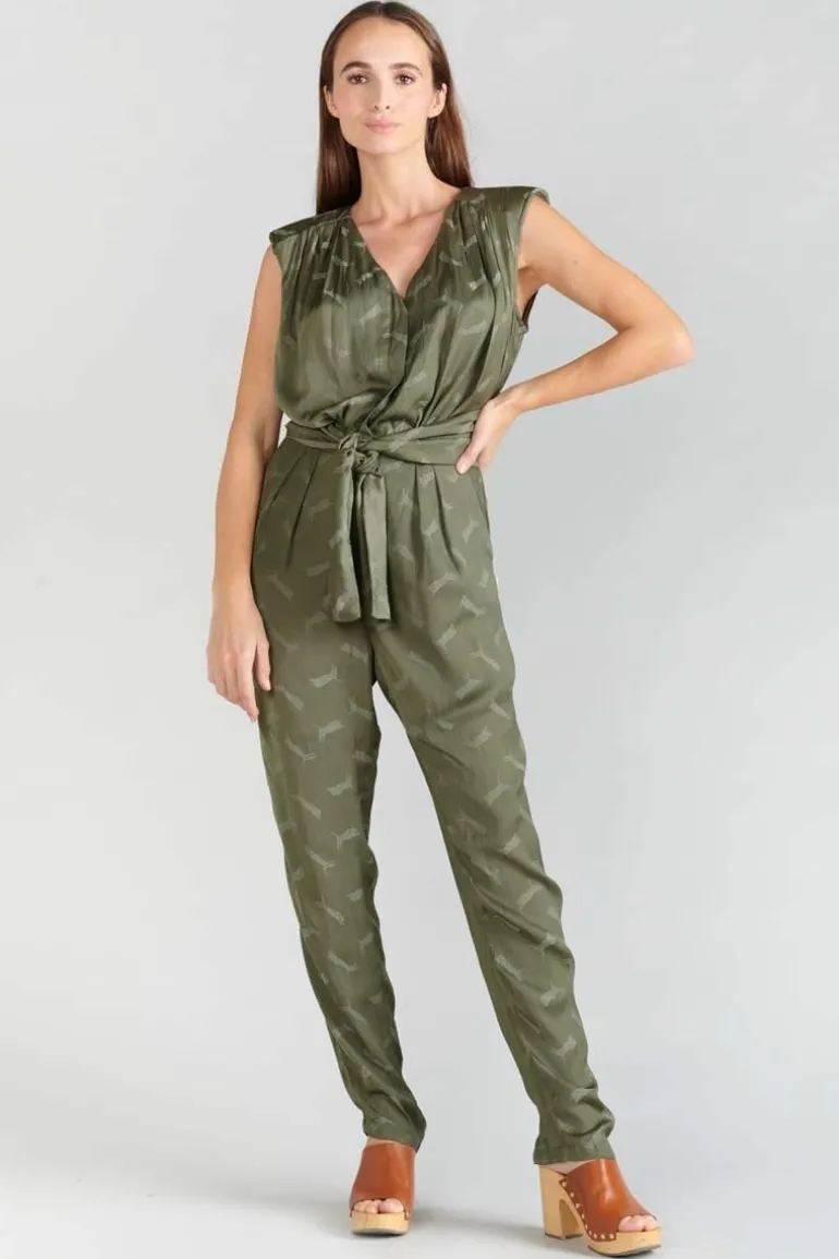 Cette Combinaison Pantalon Arte Est Tres Elegante Et Feminine Avec Son Jacquard Kaki A Motif Tigres, Ses Epaulettes Et Son Col V. Pour Plus De Style, Deux Liens A Nouer Au Niveau De La Taille A L’Avant Ou A L’Arriere Selon Vos Envies. Pour Plus De Confort, La Patte De Boutonnage Et La Fermeture Zippee Sont Invisibles.