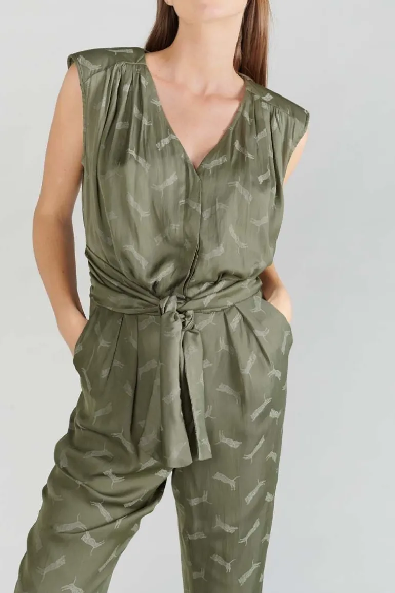 Cette Combinaison Pantalon Arte Est Tres Elegante Et Feminine Avec Son Jacquard Kaki A Motif Tigres, Ses Epaulettes Et S…