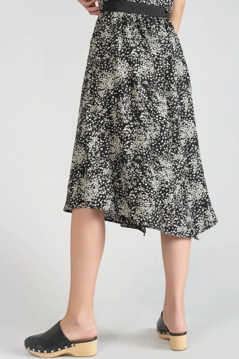 Cette Jupe Longue Cassand Est Tres Feminine Avec Son Twill Satine Fluide A Motif Fleuri Noir Et Blanc Et Au Toucher Doux Ainsi Que Sa Decoupe Originale Sur L’Avant Et Au Dos. Pour Plus De Confort, Sa Taille Est Elastiquee Et Personnalisee Le Temps Des Cerises En Fils Brillants Noirs Au Dos.