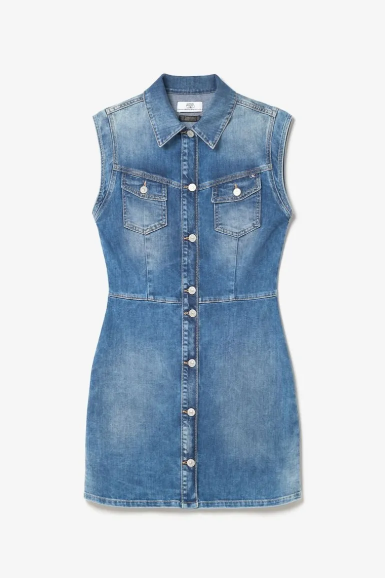 Cette Robe Sans Manches Diderot En Jeans Bleu Est Un Intemporel Du Dressing Feminin Avec Sa Coupe Droite, Son Boutonnage Visible Argente Et Ses Deux Poches Poitrine Boutonnees. C’Est La Piece Ideale Pour L’Ete.