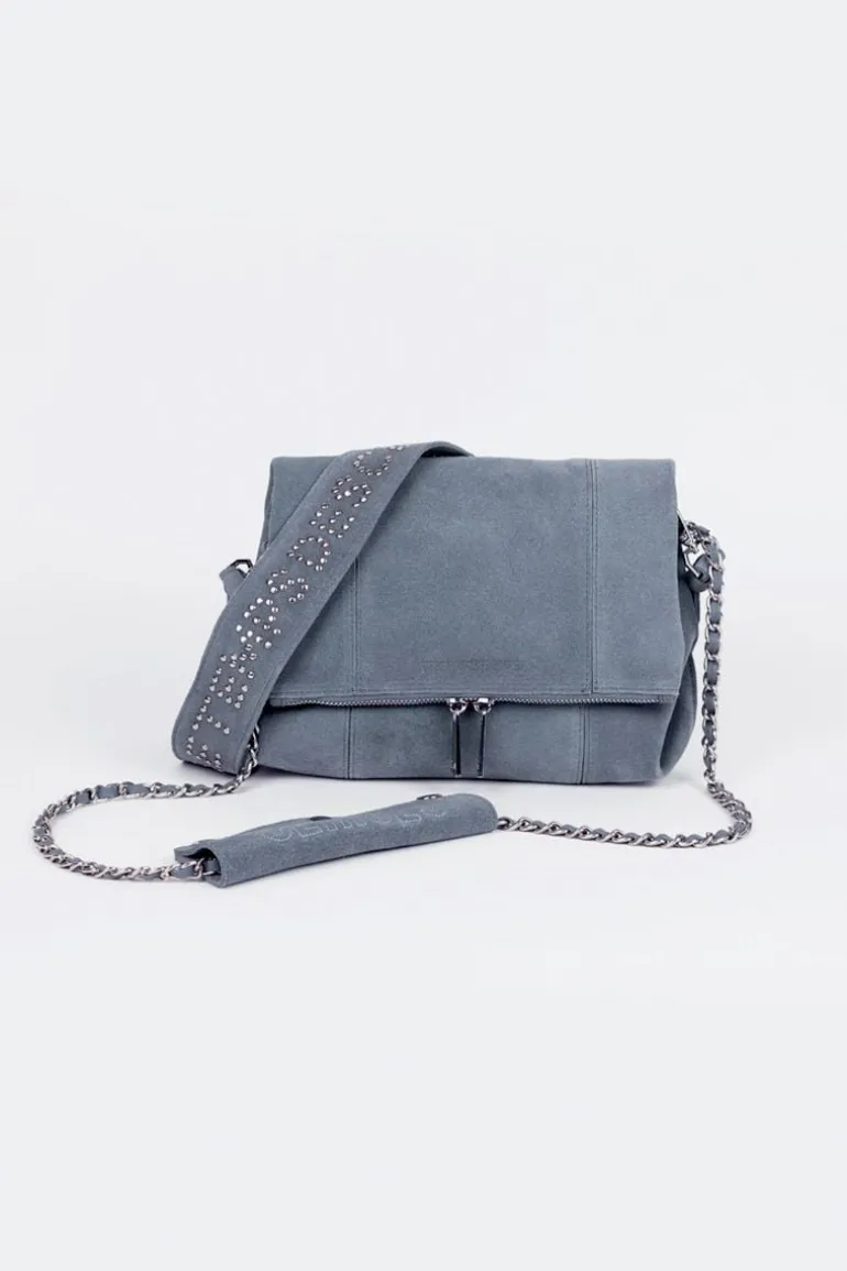 Ce Sac Leter En Cuir Suede Bleu Denim Vous Offre Deux Looks Avec Ses Deux Bandoulieres : Une Amovible Cloutee Personnalisee « Le Temps Des Cerises » Et La Seconde Fixe En Chaine Argentee Et Cuir Avec Un Renfort D’Epaule Amovible Cloute Et Personnalise « Cerises ». Ses Multiples Compartiments, A L’Interieur Du Rabat, Sous Le Rabat Et A L’Arriere, Vous Permettront De Ranger Toutes Vos Affaires.
