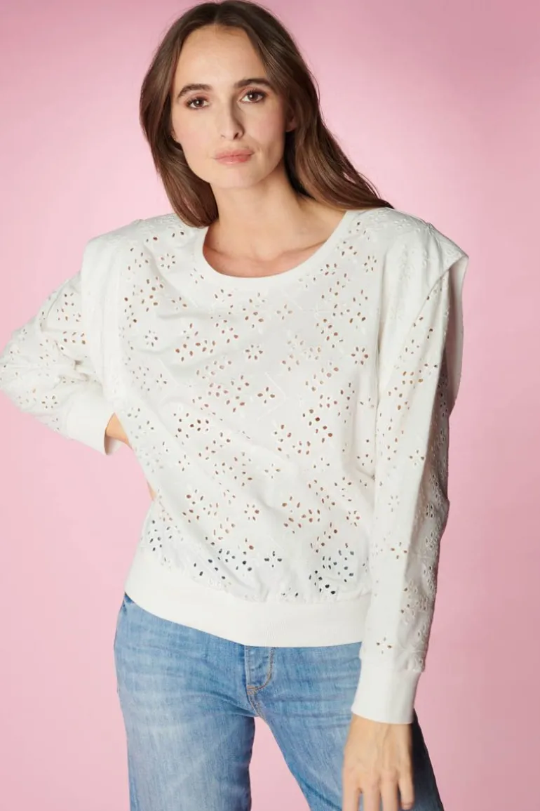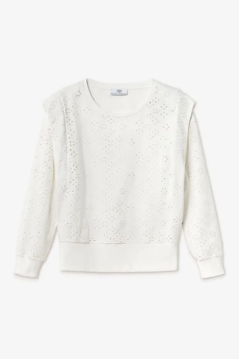 Ce Sweat Plume Est Tres Feminin Avec Son Tissu Blanc Ajoure En Broderie Anglaise, Mais Est Egalement Tendance Avec Ses Plis Au Niveau Des Manches Qui Donnent Un Effet Epaulette.