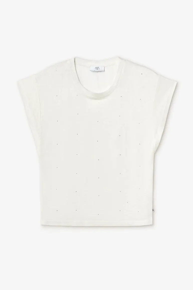 Ce Top Overs Creme En Lin Sur Le Devant Vous Donnera Un Style Casual Avec Sa Double Matiere Fluide Et Sa Coupe, Mais Aussi Feminin Avec Ses Petits Brillants Argentes A L’Avant Pour Plus De Style.