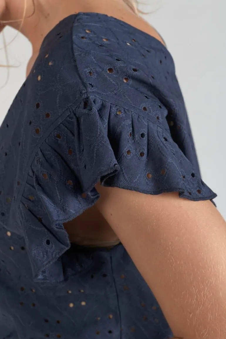 Ce Top Pedrina Bleu Marine Ajoure En Broderie Anglaiseest Feminin Et Raffine Grace A Ses Details Comme Ses Volants Sur Les Manches Ainsi Que Ses Boutons Qui Ajoutent Le Cote Chic Au Top.