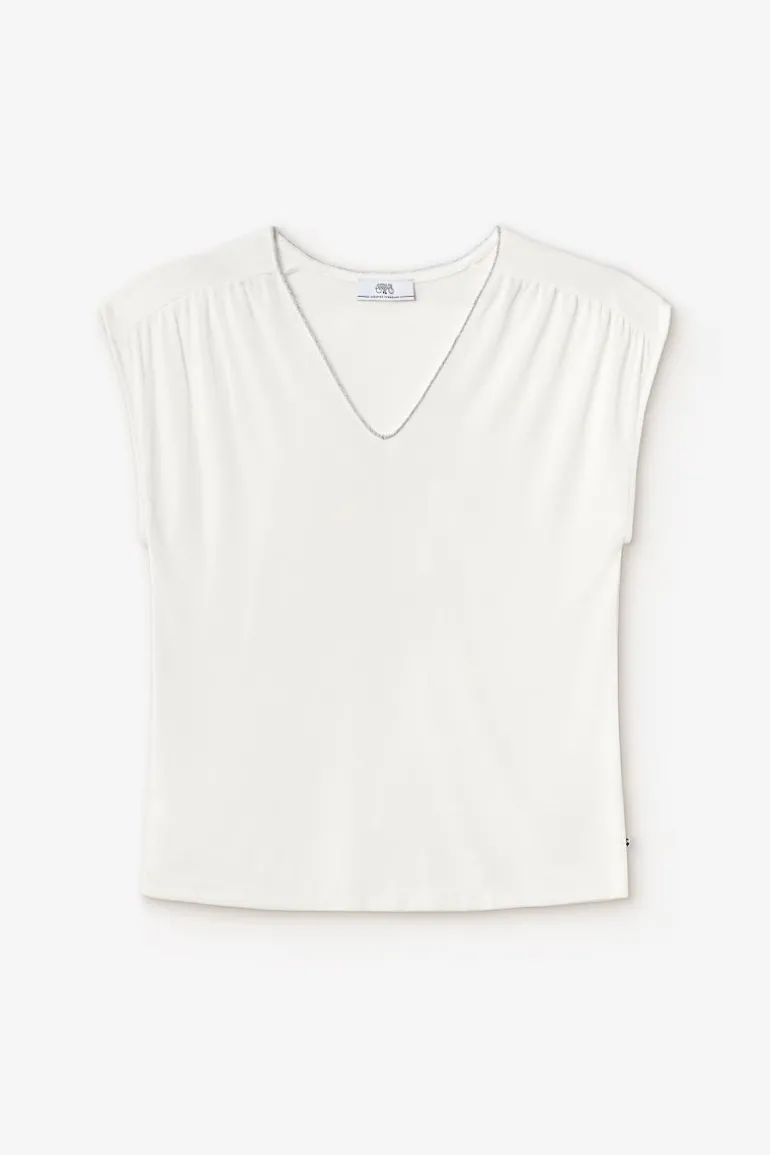 Ce Top Sidy Sans Manches Est Tres Elegant Et Raffine Avec Son Tissu Blanc Legerement Satine Et Son Lisere Argente Au Niveau Du Col . Pour Plus De Confort, Le Tissu Doux Et Fluide Est Agreable A Porter.